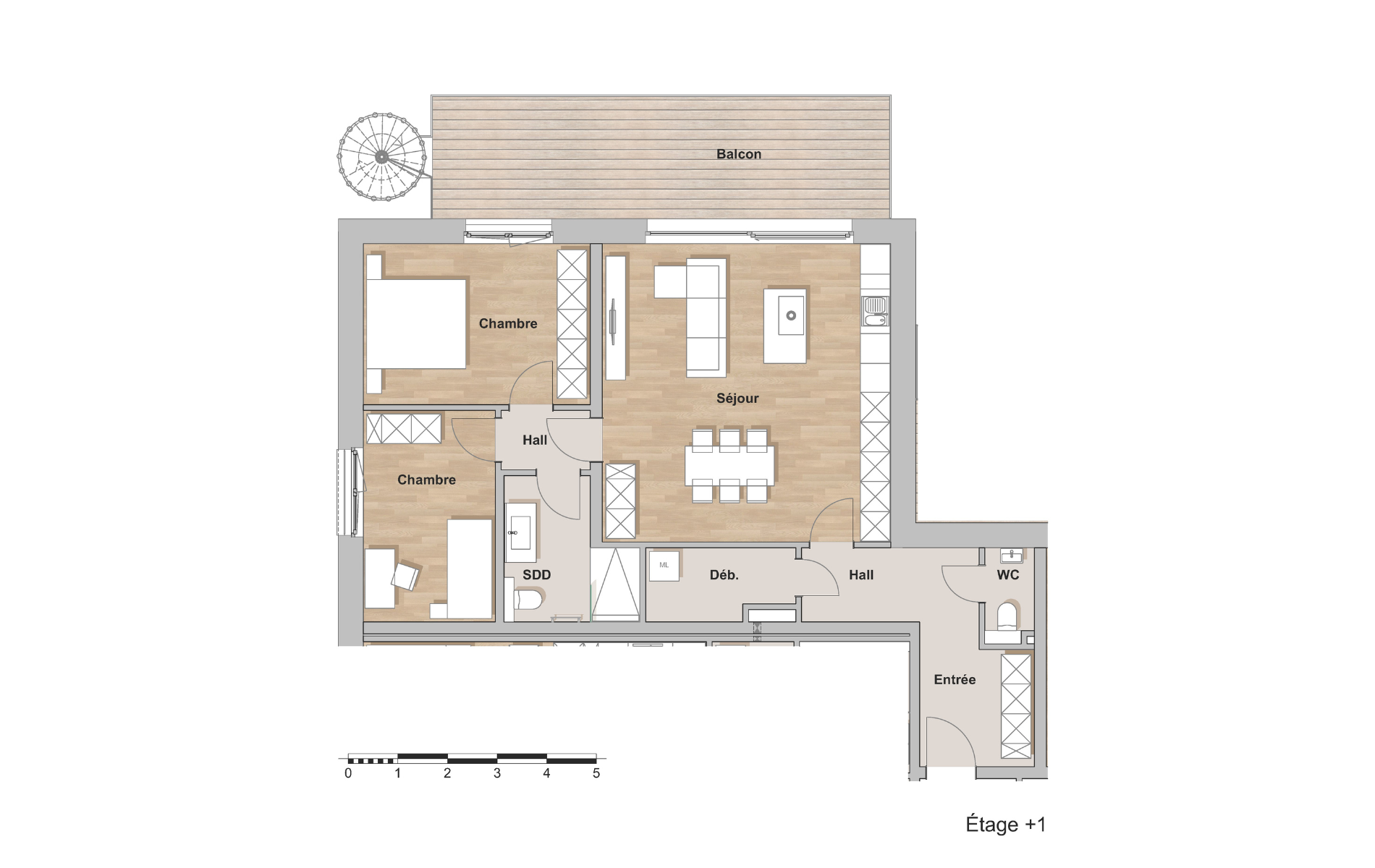 Wohnzimmer mit offener Küche, Badezimmer mit Dusche und WC, separates WC, 2 Schlafzimmer, Eingangsbereich/Hall, Débarras , Balkon 22,82 m² und Terrasse 40,58 m² im Erdgeschoss mit über 250 m² Gartenfläche (erreichbar vom Balkon über eine Außentreppe).