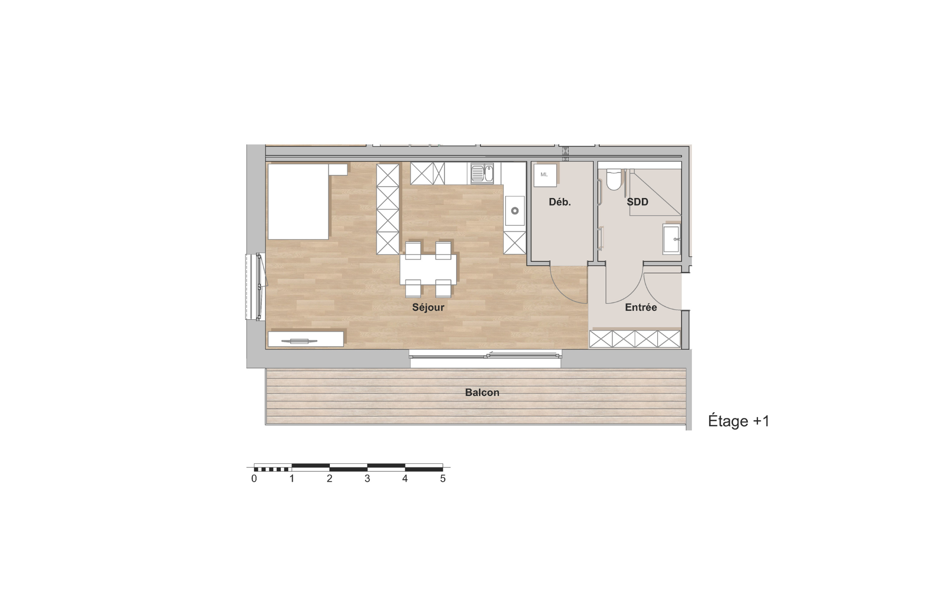 Wohnzimmer mit offener Küche und Schlafbereich, Badezimmer mit Dusche und WC, Eingangsbereich und Débarras.