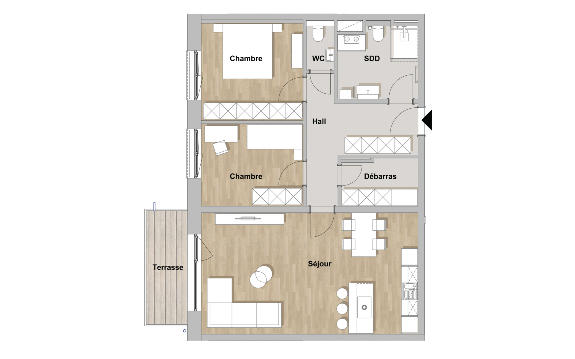 Wohnzimmer mit offener Küche, Badezimmer mit Dusche und WC, separates WC, 2 Schlafzimmer, Débarras, Eingangsbereich/Hall.
